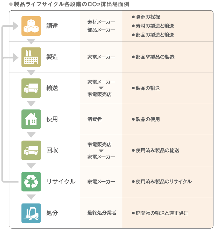 調達から回収・リサイクルされるまでの製品ライフサイクルを考えてみると、図のようにさまざまな場面でCO2が排出されることがわかります。家電製品は使用期間が長期にわたるため、ライフサイクルの中でも使用中に発生するCO2排出量の割合が高くなっています。
