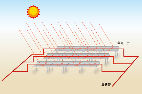曲面鏡を用いて、鏡の前に設置されたパイプに太陽光を集中させ、パイプ内を流れる液体(オイルなど)を加熱し、その熱で発電する発電方式。建設が比較的容易で建設コストも低く、ベース電源として期待されています。