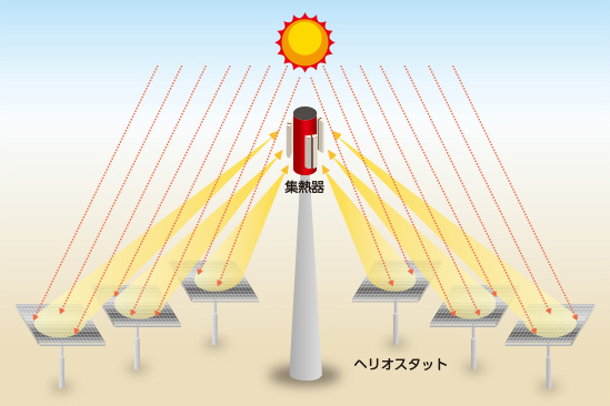 ヘリオスタッドという平面鏡を用いて、中央部に設置されたタワーにある集熱器に太陽光を集中させることで集光し、その熱で発電する発電方式。集光するために太陽の追尾が必要であり建設コストが高いものの、ミドル電源からベース電源として期待されています。
