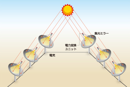 放物曲面状の鏡を用いて、鏡の前に設置されたスターリングエンジンなどに太陽光を集中させ、発電する発電方式。単体で機能するため導入コストは高いものの、グリッド接続ができない地域での活用が期待されています。