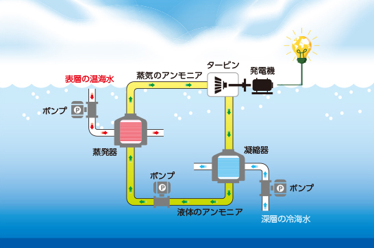 発電方式としては、直接海水を蒸発させるオープンサイクル方式と、作動流体にアンモニアを用いるクローズドサイクル方式があります。