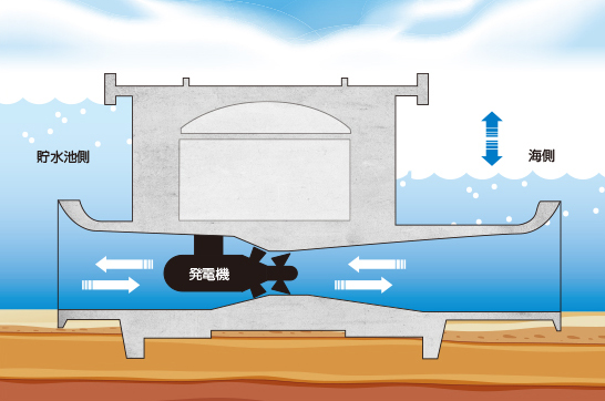 潮汐流発電は、潮汐に伴う潮位差を利用して水車を回し発電する方式です。水力発電を応用した古くから実用化されている技術であり、代表的なフランスのランス発電所は1967年から運転しています。