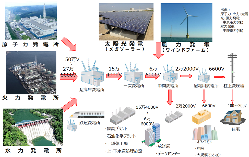 電力流通経路の各箇所にある機器を表すイメージ図は以下の通りです。