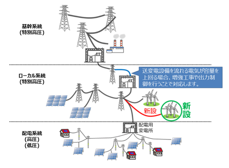 新しい電源(発電所)が電力系統へ接続(系統アクセス)すること等によって、送変電設備を流れる電気が送変電設備の容量を上回るような場合には、送電線や変圧器を新設したり容量の大きい設備に変えるなどの設備の増強工事を行ったり、送変電設備の容量内に収まるように電源の出力を制御することで対応しています。