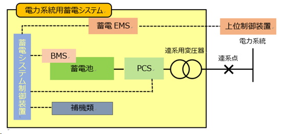 「電力系統用蓄電システム」とは、需給調整・調整力提供・地域レジリエンス電源など、電力システムの運用に必要な機能提供を主目的に設置される蓄電池を適用した蓄電システムです。