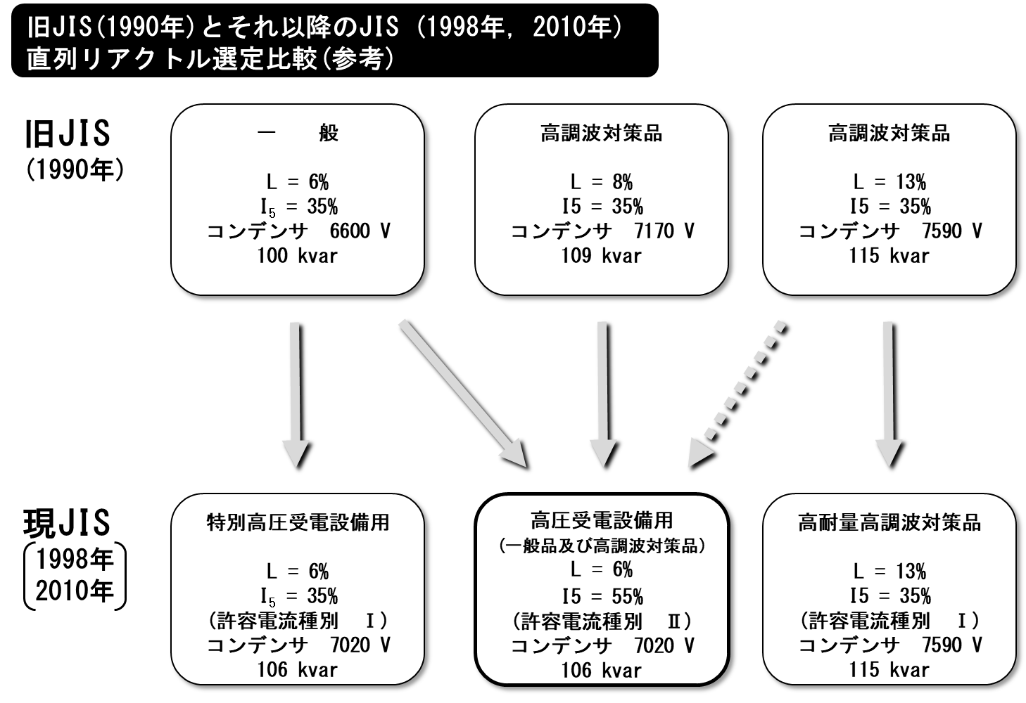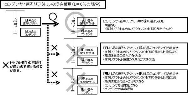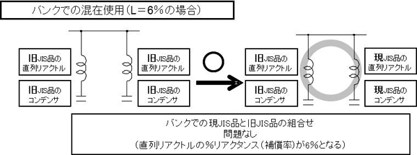 - 1998年より前の旧JIS準拠品(1990年版)と1998年以降の現JIS準拠品(1998年及び2010年版)の組み合わせは、直列リアクトルのリアクタンス(%)が変化して危険です。旧JISの機器を交換する場合は、組み合わせる他の機器も現JIS品へ交換下さい。