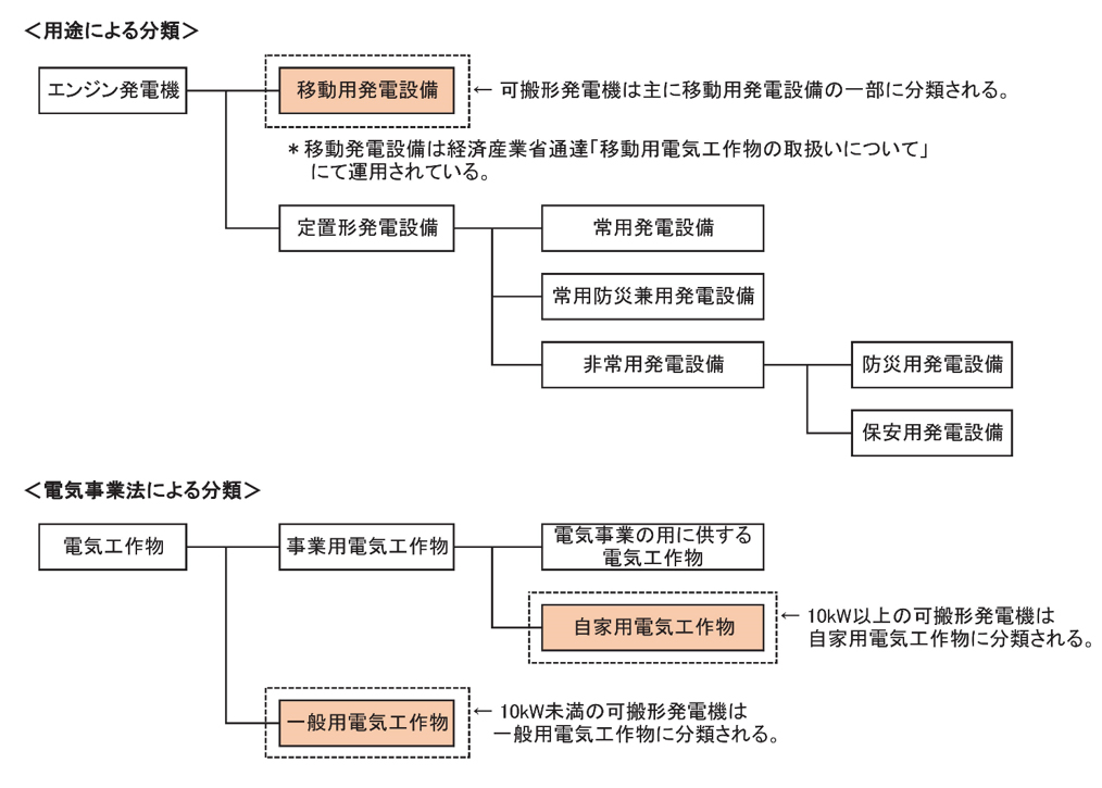 エンジン発電機は、用途では大きく2つに分類となり、可搬形発電機は、主に経済産業省通達「移動用電気工作物の取扱いについて」にて運用される移動用発電設備の一部に位置づけられます。また、可搬形発電機は電気事業法上による分類では、10kW未満は一般用電気工作物に、10kW以上は自家用電気工作物に位置づけられます。