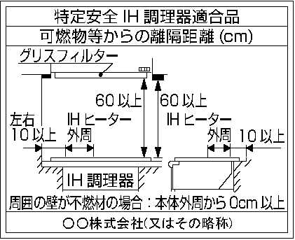 下記に掲載する特定安全IH調理器は、総務省消防庁通知『電気を熱源とする調理用機器とグリスフィルターの離隔距離について』(令和3年5月10日消防予第231号)で定める火災安全対策が施され、かつ消防庁告示『対象火器設備等及び対象火気器具等の離隔距離に関する基準』(平成14年3月6日消防庁告示第1号)に基づき可燃物等までの離隔距離を定めている機種で、一般社団法人日本電機工業会が定めた自主基準に適合し、製造または販売事業者から届出された機器を掲載しております。