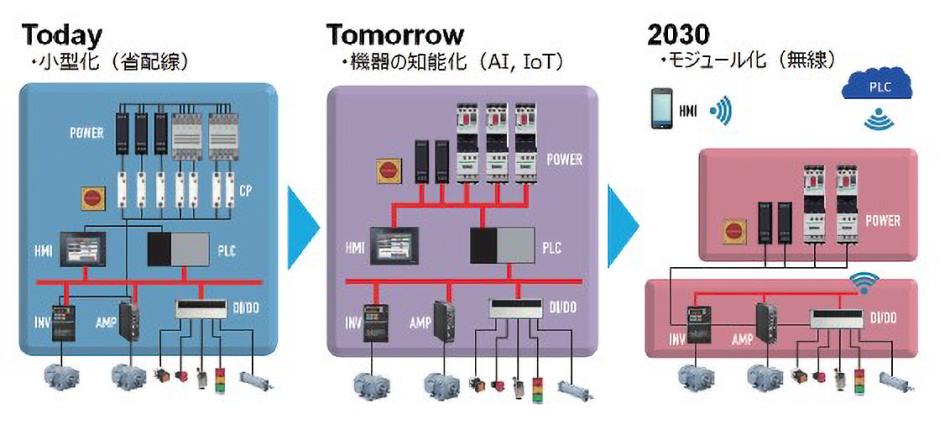 2016年10月に「制御盤2030WG」を発足し、制御盤製造業の労働生産性向上と高付加価値化について継続的に議論を重ね、2019年11月に発行したホワイトペーパー の中で2030年の制御盤の将来像(図2)について提示した。