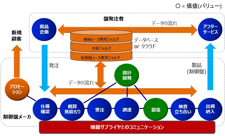 DX推進施策に基づき、制御盤製造業のバリューチェーンのあるべき姿を図3に示す。ポイントは以下のとおり。