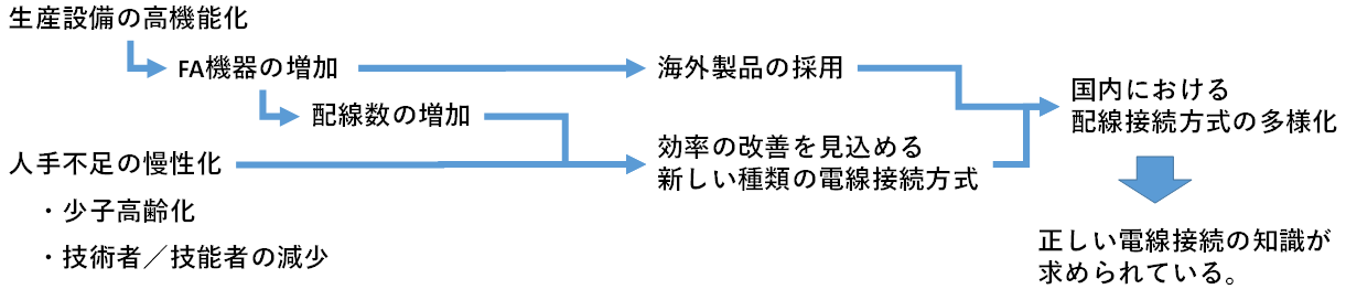 近年、国内製造業各社の生産現場では、市場環境の変化に合わせて生産設備の高機能化が求められており、それに呼応する形で制御盤に搭載される制御機器などのFA機器も増加し、膨大な配線で作業が複雑化している。制御盤組立工程の中で、電線接続作業(加工・配線)は作業量の半分以上を占めており、生産性の向上のため、電線接続作業を効率化することが求められている。一方で、電線接続方式には多くの種類があり、新しい種類の電線接続方式を具備した制御盤内機器も国内で販売されている。