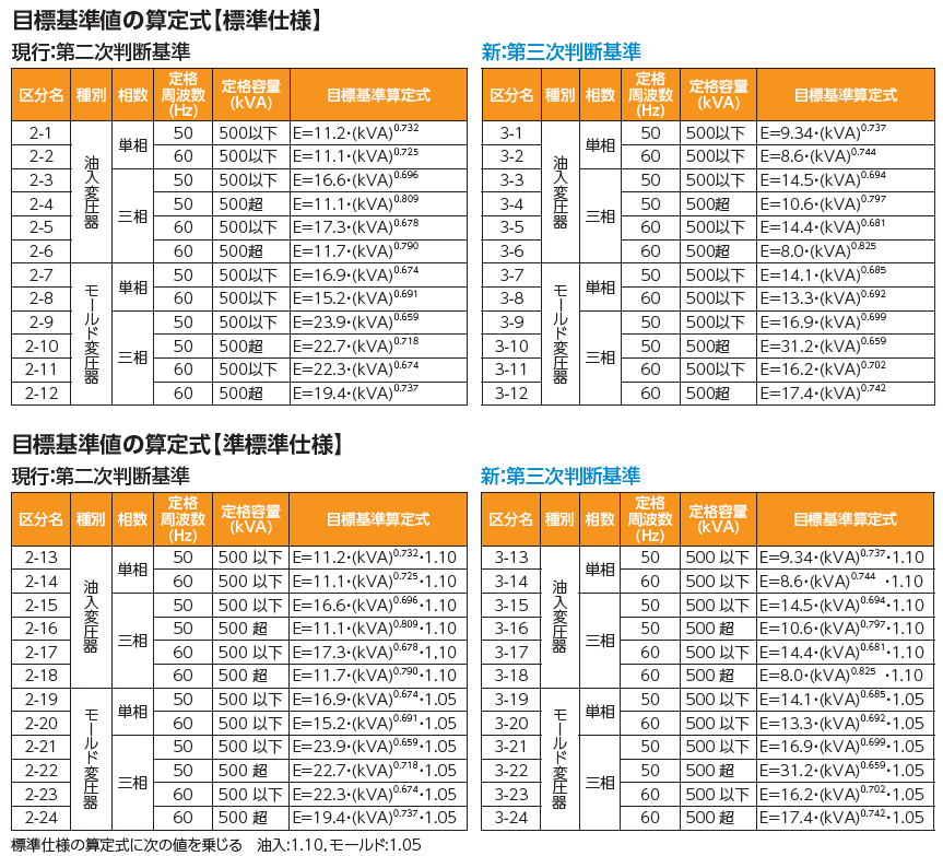 現行のトップランナー制度における変圧器の基準では、種別、相数、定格周波数、定格容量、標準仕様又は標準仕様状態で使用しないものの5つの要素により区分が分けられており、それぞれの組み合わせにより全24区分(標準仕様12区分、準標準仕様12区分)に分かれています。それぞれの区分毎に新基準のエネルギー消費効率の算定式が定められます。