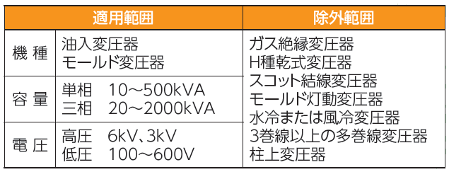 そのため、より広範囲での高効率化を図る事が地球温暖化への環境対策のうえでも重要であり、特殊用途を除く下表の変圧器が対象となります。