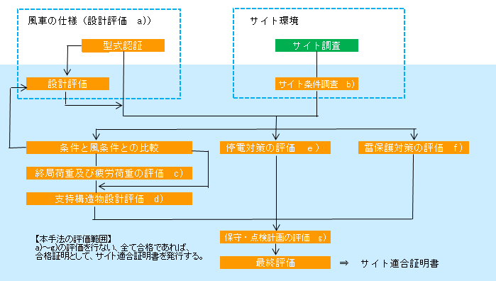 「風力発電のサイト適合性評価手法」は、風車又はウィンドファームを設置するサイト条件の評価及びサイト条件と選定した風車との適合性を評価する手順を記している。評価の手順及び範囲を図4に示す。