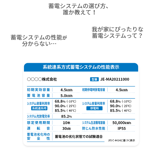 製品を選ぶときに簡単に比較できるように、 蓄電システムの主な性能を 分かりやすくラベルにしたものです!
