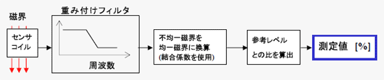 参考レベルを満足していれば基本制限を満足しますが、参考レベルを上回った場合でも、必ずしも基本制限を満足しないことになりません。これは、製品に近い人体の一部分では比較的強めの電磁界の曝露を受けることもありますが、製品から少し離れた他の部分の曝露は急激に弱くなるので、実際の使用環境においては、頭部や胴体を含めた全身への一様な磁場を想定したICNIRPのモデルと同じ条件にならないことが理由です。 このため、IEC(国際電気標準会議)では家電製品に対して適用する測定方法と判定方法(IEC 62233)が制定されています。IEC規格では、不均一な磁界を、均一な磁界の測定値に換算する係数(規格では結合係数と呼んでいます)を導入し、測定値にこの係数を乗じた値が参考レベルを超えていなければ、ICNIRPのガイドラインに適合とする判定方法を規定しています。また、参考レベルの値は周波数に対して一定ではなく、周波数に依存した値です。製品からの磁界も複数の周波数が含まれていることから、磁束密度を測定するだけではICNIRPのガイドラインへの適合判定はできません。このことから、周波数特性を持つフィルターを使用して重み付けを行い、参考レベルに対する比率(%)によって測定値を表現する測定方法を規定しています。この手順の概要を下図に示します。なお、IEC 62233は、JIS C 1912としてJIS化されています。