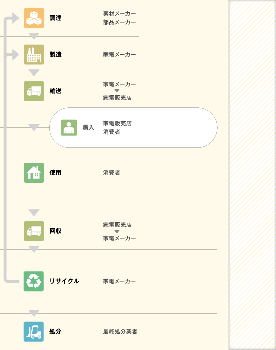 素材調達から製品の使用後までの製品のライフサイクルでエコ用語を調べることができます。
