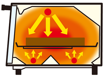 このヒーターから出た赤外線の放射(輻射)と、ヒーター熱によって加熱された庫内の空気の対流によって、食品を加熱します。