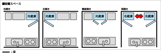 下図のように設置場所に応じて、右開き、左開き、観音開き、両開きなどがあります。例えば、右側に壁があれば、右開きの冷蔵庫をお勧めします。
