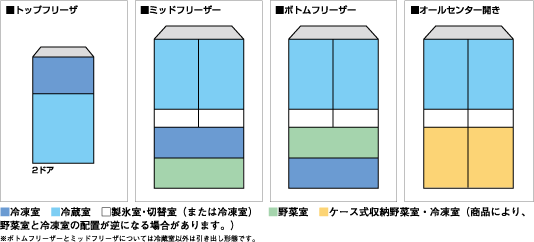以前は、シンプルな2ドア~3ドアタイプが主流でしたが、現在は、製氷室や温度切替室を搭載したり、冷蔵室の扉が観音開きになるなど、5ドア~6ドアタイプが主流です。