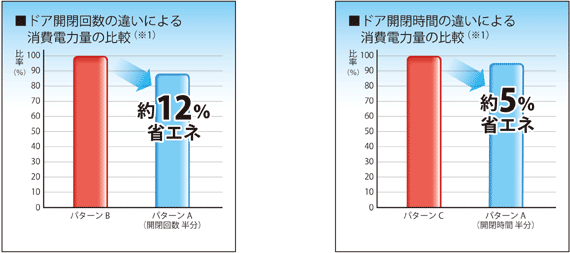 ドアの開閉回数を半分に減らすと約12%省エネになった例や、開閉時間を半分に減らすと約5%省エネになった例があります。※1