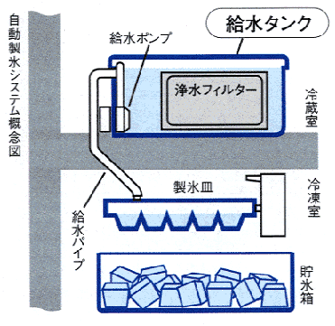 自動製氷機の給水タンクや浄水フィルター、また水受皿のあるタイプは、水受皿や給水ポンプ付近も水洗いして下さい。
