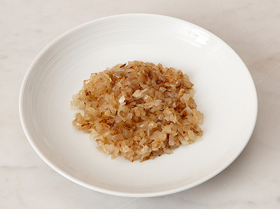 ① みじん切りしたたまねぎを耐熱皿に広げて、