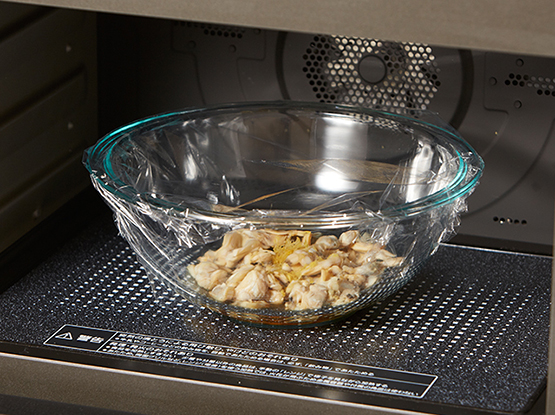 ラップをはずした状態でレンジ600Wで約2分加熱する。