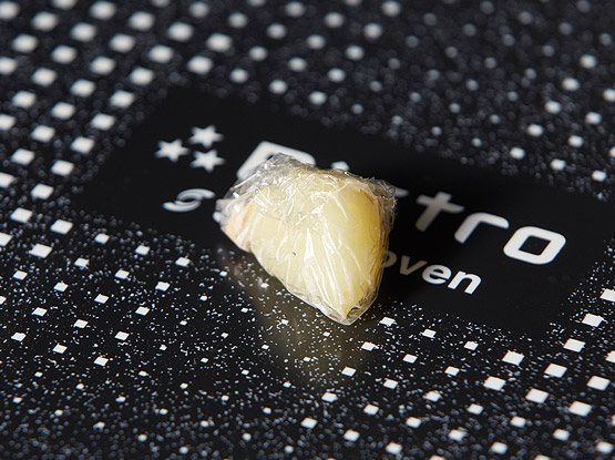 ① 薄皮を付けたまま、ラップに包み庫内中央に置く。