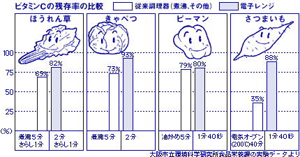 また、スピード加熱により、熱に弱いビタミンCをこわさず、高い残存率を示します。
