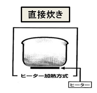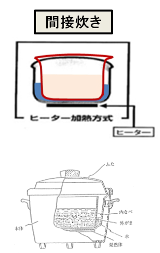 二重釜とも呼ばれる加熱方式で、外釜に水を入れ、本体底のヒーターで外釜内の水を加熱し、間接的に内釜のお米を加熱・蒸しあげます。