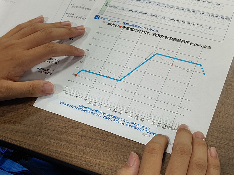 実験に際しては実験器具のレイアウトを印刷した紙を用意し、各実験器具をその上に配置・固定することで、配置・接続がスムーズに行えるよう独自の工夫も凝らしている。炊飯器の温度変化に関する再現実験では、1 回目の実験結果を改善しようとするあまり、2回目の実験では温度が上がり切らない結果になってしまったが、制御の難しさや改善に向けた取組みの繰り返し(トライアンドエラー)の重要性などを学んでもらえたと思う。こうした体験が電気を理解し、理科を好きになってもらう一助になればと考えている。