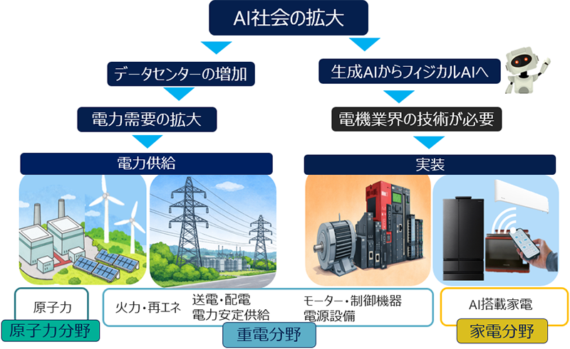 その理由は大きく2つあります。1つは、データセンターが増加し、電力需要が拡大することにより、電力インフラの重要性が高まっているためです。もう1つは、ロボットなどのフィジカルAIの発展には、モーターや制御機器といった電機技術が必要不可欠だからです。
