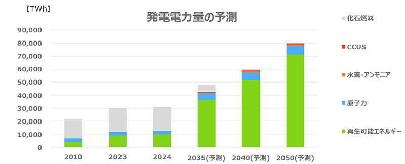 世界の発電電力量を見てみると、今後も増加が続き、2050年には2024年の約2.6倍にまで拡大すると見込まれています。