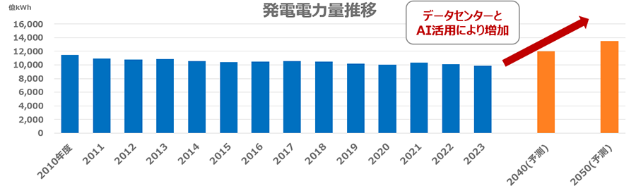 今後の日本の発電電力量の2040年、2050年度予測(JEMA推計)は、データセンタ、AIの活用により電力量は大きく伸びていくと想定されています。