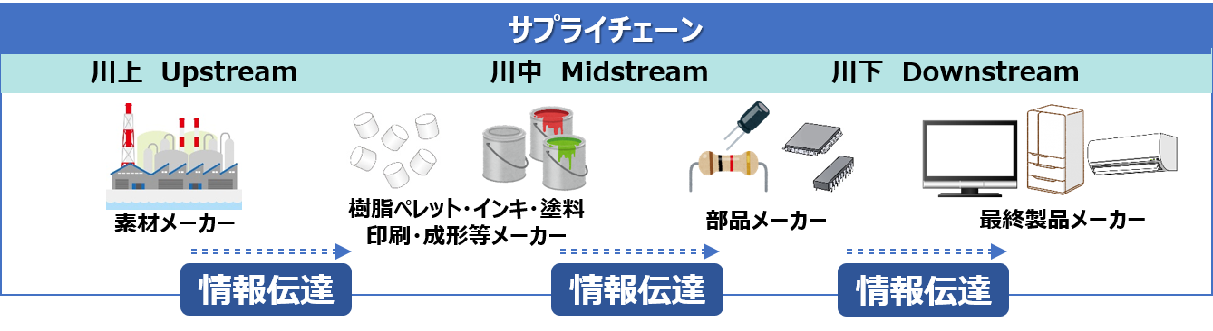 製品に含有される化学物質の情報を把握するには、 原材料を製造する企業(川上)⇒部品を製造する企業(川中)⇒最終製品を製造する企業(川下)というサプライチェーン全体で、化学物質の情報伝達が必要になります。