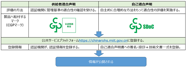 - 合格評定制度:「有害物質使用制限目録」対象の12品目に該当する製品は、非含有証明のための適合性評価を行い、CGPマーク(China Green Product Mark)の貼付が要求される。適合性評価方法によってマークが異なる。