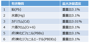有害物質の扱いとなる6物質は右表のとおり(2023年7月時点)。