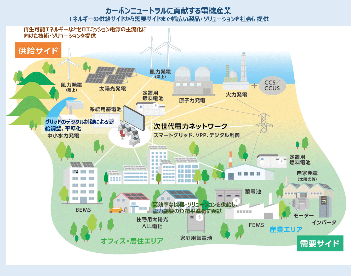 電機産業は、これらエネルギーの供給サイド、需要サイド双方において、社会実装まで見据えた技術開発やイノベーションにより、政府のグリーン成長戦略が示す方向の下、気候変動への対応をビジネスチャンスと捉え、カーボンニュートラル実現に資する製品・ソリューションを社会へ提供し、持続可能な社会の構築に貢献していきます。