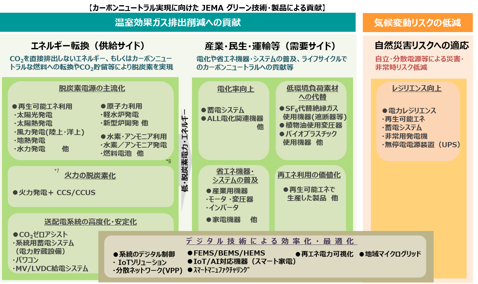 JEMAは、電機産業の技術・製品を通じてカーボンニュートラル実現に果たす貢献を「環境価値」として整理・分類し、具体的な技術・製品等のソリューションを「JEMAグリーン技術・製品」と定義し、その分類・リストを2021年11月にVer1.0として策定・公表しています。これらの環境価値は、今般、まずはカーボンニュートラルへの貢献の側面から設定していますが、企業における環境課題やその取組みは幅広いものであるため、環境価値の項目とグリーン技術・製品については、今後の社会動向や状況の変化に応じて適切に見直すとともに、充実を図り、継続的にアップデートしていきます。