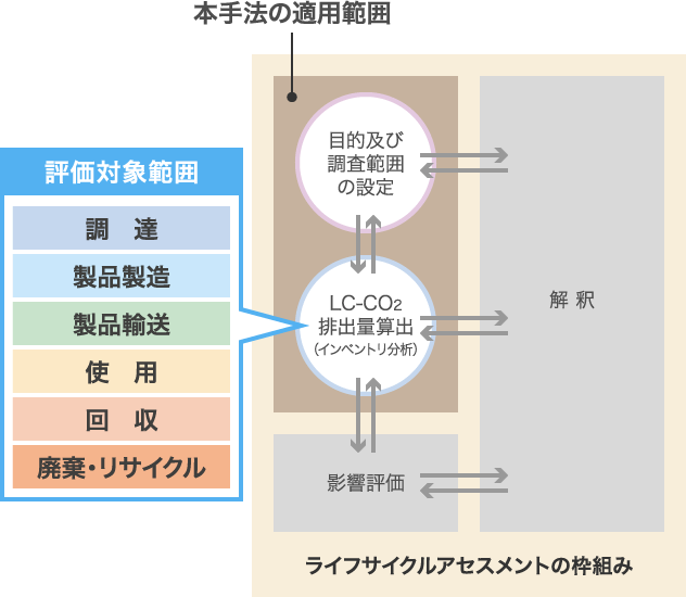 本手法はライフサイクルアセスメントの手順のうち、目的及び調査範囲の設定と、インベントリ分析に適用します。 この手法によるLC-CO2排出量算出はインベントリ分析に相当し、その評価範囲は調達から廃棄・リサイクルまでです。